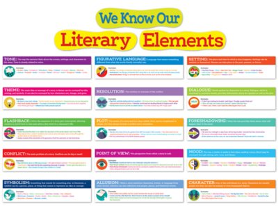 Big, bright, illustrated cards display 15 essential literary elements and provide definitions and examples for each! This bulletin board set helps students explore plot, setting, character, conflict and resolution, mood, voice, point of view and more! Set includes 16 pieces, plus an activity guide; “We Know Our Literary Elements” header measures 5" x 24".