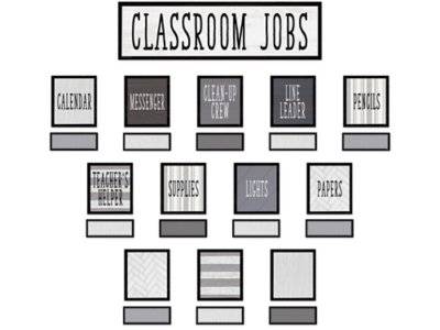 Cultivate a sense of responsibility and teamwork with this classroom helpers bulletin board set featuring sleek, contemporary combos of black, white and gray! It includes titles for the clean-up crew, line leader, messenger, teacher’s helper and more, plus customizable blank pieces. Set includes 49 pieces; header piece measures 6" x 21".