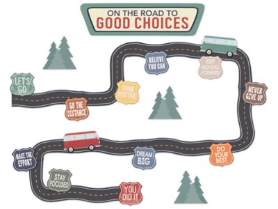 Transform your classroom into a dynamic learning destination with these travel-themed graphics and uplifting messages. Arrange the road pieces, tree elements and traffic signs to create a classic road trip scene where students become the drivers of their own educational journeys! Set includes 30 pieces; header piece measures 5 1/8" x 20".