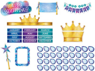 Wish students a happy birthday in magical style with this enchanting bulletin board set—and make birthdays extra-special! Set includes 55 pieces—12 monthly pieces, 36 student jewels, a “Happy Birthday” sign, a wearable gold crown, a “Make a Wish” wand, a blank scroll sign, a blank jewel card/photo frame, a “You Are Magical” banner sign and a customizable crown sign. Largest piece measures 10 1/4" x 13 1/2".