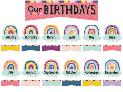 Students will love seeing their names on prominent display with this cheery, colorful birthday bulletin board set! The set comes with one label for each month of the year, 40 tags to display names under the months, plus an “Our Birthdays” header piece. You even get a guide with suggestions and activities. Set includes 53 pieces; header piece measures 5 3/4" x 21".