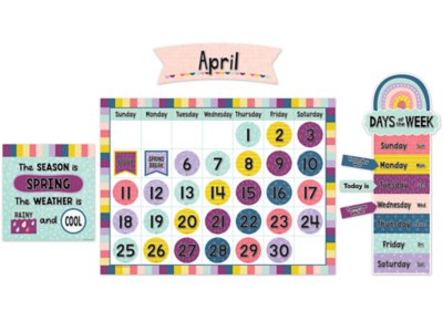 This boho-chic bulletin board set comes with everything you need for a complete classroom calendar—from easy-to-read number pieces and colorful monthly headers to a “Days of the Week” sign and arrows that indicate what “Today Is,” what “Tomorrow Will Be” and what “Yesterday Was”! Set comes with 96 total pieces, including a blank calendar, holidays and special occasions, seasons and weather pieces, and more; blank calendar measures 18" x 24".