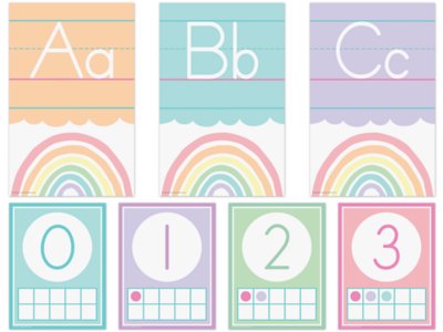This eye-catching, pastel-colored bulletin board set is a handy visual reference for students learning the alphabet and numbers! Pack includes 37 pieces—26 alphabet cards featuring both upper- and lowercase letters, plus 11 cards covering numbers and quantities 0–10. Alphabet cards measure 5 1/2" x 8 1/2", and number cards measure 4 1/4" x 5 1/2".