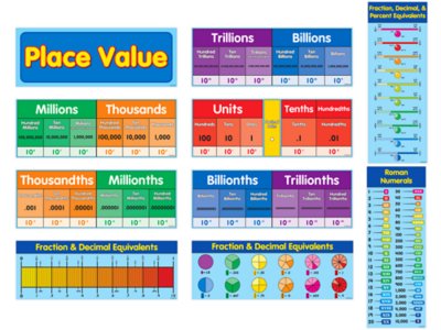 Our all-in-one bulletin board set features big, colorful displays that make it super-easy for the whole class to see place value concepts! Set includes a 10' place value display showing values from trillionths to trillions…4 detailed charts highlighting fractions, decimals, percentages and Roman numerals…and a place value title card. Charts measure 8 3/4" x 24".