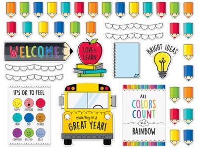 Make way for a great year—with a classic school-themed bulletin board set featuring bright colors and a cheerful design that are perfect for showcasing outstanding work, adding style to your back-to-school display or inspiring students to learn! Use it in a hallway, on a classroom door or on a bulletin board—it’s great for welcoming students to a new school year! The set includes 41 pieces—a “Welcome” banner, a “Make Way for a Great Year!” school bus, 30 student pencils, a “Bright Ideas” lightbulb, a “Love to Learn” sign, 4 loop borders, a spiral notebook page and 2 motivational posters. Largest piece measures 16 7/8" x 18 3/8".