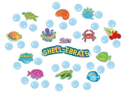 “Shell-ebrate” students’ birthdays with these ocean-themed accents! Pack includes 46 pieces—a 2-piece “Let’s Shell-ebrate” header, 12 month pieces and 32 bubbles; largest piece measures 20" x 5 1/4".