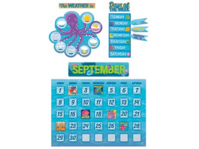 This calendar set is a great way to encourage your students to “seas” the day, the month or even the year! The ocean-themed set will add creativity to bulletin boards, hallways, walls, cubbies and more. Set includes 98 pieces—a giant calendar grid, 12 month headers, 33 dates, 37 special days, a “Days of the Week” header and a chart with 3 indicators, and a 10-piece season and weather set; largest piece measures 24" x 17".