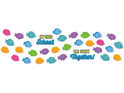 Encourage your students to “swim together” with these sea-themed accents. Add the pieces to hallways, walls, whiteboards, cubbies and more for a fresh new look! Pack includes 36 pieces—a 6-piece “In This School We Swim Together” header and 30 colorful fish; largest piece measures 17 3/10" x 5".
