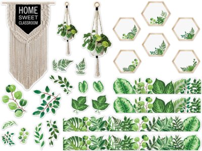 Featuring soothing colors, natural-looking elements and trendy designs to spark children’s imaginations and curiosity, this bulletin board set helps you create a classroom environment where students feel right at home! The set includes 58 pieces—a large “Home Sweet Classroom” macramé header, 4 leaf border panels, 2 hanging planters and 51 accents (assorted leaves and hexagons); largest piece measures approximately 8 3/4" x 14 2/5".