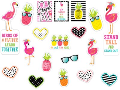 Inspire students all year long with this motivational bulletin board set that’s great for visual reinforcement! Featuring a sunny tropical design, bright pops of color and words of encouragement, the set includes 22 pieces—3 rectangular posters, 2 flamingo quote posters, 2 pineapple-themed signs with sayings and 15 accent pieces in various designs. Largest pieces measure 5 3/5" x 19 2/5".