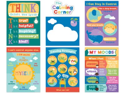 Featuring soothing colors, cute graphics and inspirational messages, this bulletin board set helps students deal with negative emotions! Set includes 7 pieces—a customizable blank header, a “Calming Corner” overlay and 5 charts—plus a resource guide. Each chart measures 17" x 23".