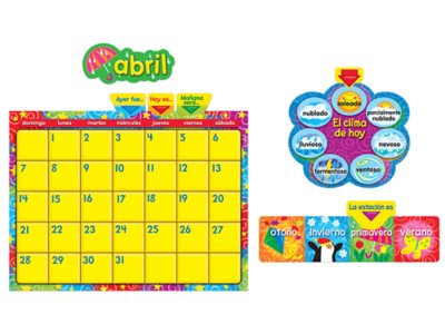 This bright, colorful bulletin board set comes with everything you need for a complete classroom calendar in Spanish—from easy-to-read number pieces and themed monthly headers to arrows that indicate what “Today Is,” what “Tomorrow Will Be” and what “Yesterday Was”! Set comes with 128 total pieces, including a dry-erase blank calendar, holidays and special occasions, seasons and weather pieces, and more; the blank calendar measures 17 1/2" x 23 1/4".