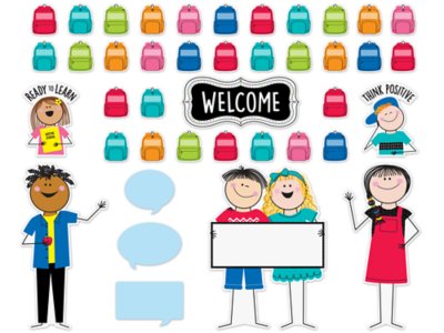Here’s a wonderful bulletin board set that lets you establish an inclusive tone in your classroom—with multi-ethnic stick figure–style children representing diverse backgrounds, a colorful array of backpacks and more! It’s a great way to decorate your walls, feature outstanding work, add style to any back-to-school display and welcome students to a new school year! Set includes 41 pieces—a “Welcome” sign, 5 signs with stick kids, 3 blank speech bubbles and 32 student backpacks in 6 colors. Largest piece measures 16 3/4" x 23 1/2".