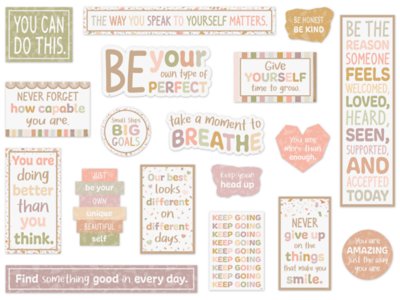 This set features a modern terrazzo design with inspirational messages that will inspire students to grow into self-confident, resilient learners. Add the pieces to hallways, walls, doorways, cubbies and more for a fresh new look. Set includes 18 pieces; largest piece measures 6" x 21".