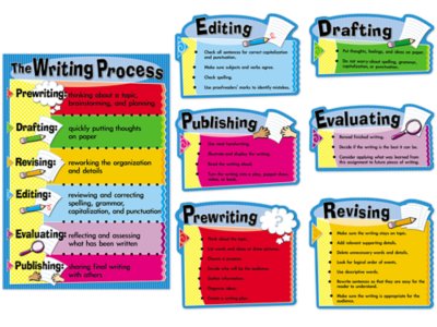 This colorful language arts bulletin board set creates a helpful display that reinforces writing strategies! Set includes 7 pieces—a writing process chart and 6 die-cut pieces that describe each step of the writing process in depth. Chart measures 17" x 24".