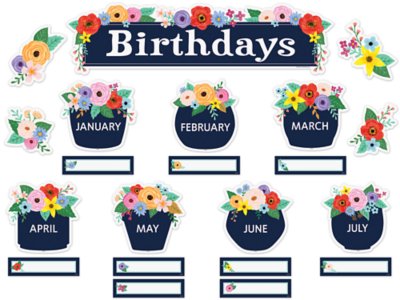 Each season brings a new batch of birthdays to celebrate! This bulletin board set has perennial value with its vibrant colors and blossoming aesthetic. Add the pieces to hallways, walls, doorways, cubbies and more for a fresh new look. Set includes 53 pieces; header measures 20 1/4" x 5 1/2".