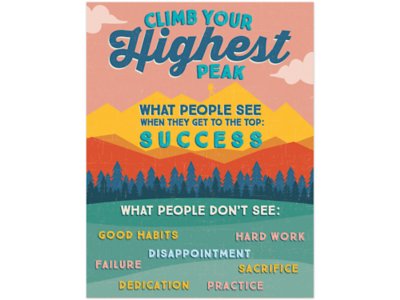 Encourage, inspire and motivate with this powerful adventure-themed poster—reminding students that it takes hard work to get to the top! Perfect for any room, wall, door or bulletin board, the poster is printed on heavyweight cardstock and measures 17" x 22".