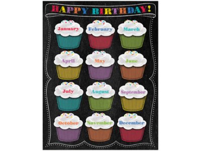 Celebrate birthdays throughout the year—with a chalkboard-style birthday chart featuring a cupcake for every month and space to write students’ names! Use it to decorate bulletin boards, hallways, doors and common areas. Chart measures 17" x 22".