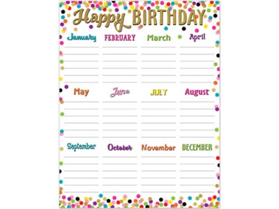 Celebrate birthdays throughout the year—with a handy, confetti-style birthday chart featuring every month and space to write students’ names! Use it to decorate bulletin boards, hallways, doors and common areas! Chart measures 17" x 22" and includes activities on back.
