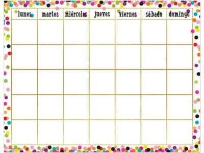 This fully customizable, confetti-themed calendar is labeled with the Spanish days of the week! Calendar measures 17" x 22".