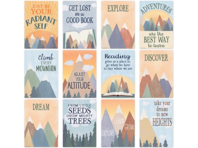 Inspire and motivate with these beautifully designed posters featuring soft, nature-inspired colors and uplifting messages that encourage growth, exploration and a love of learning. Each poster showcases unique mountain and adventure-themed artwork paired with meaningful phrases to capture students’ attention and foster a positive mindset. Pack includes 12 posters; each measures 11" x 15 3/4".