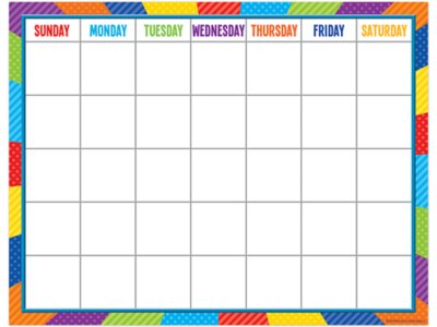 This fully customizable, playfully patterned calendar chart is labeled with the days of the week! Calendar measures 17" x 22".