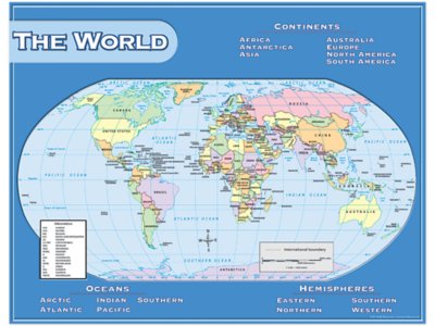 A convenient, useful poster that decorates as it educates! This 17" x 22" poster features a colorful world map with countries and boundaries labeled…lists of continents, hemispheres and oceans…plus lessons and activities on back.