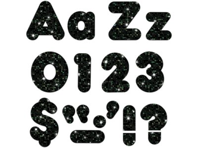 These sparkly black die-cut punch-outs are sure to get students’ attention…and they’re convenient, reusable and easy to use! Great for student work displays, bulletin boards, signs, banners, newsboards, learning activities, labeling and much more, the fade-resistant pieces feature Classic Casual font on durable cardstock. Set includes 50 uppercase letters, 82 lowercase letters, 20 numerals 0-9, 30 punctuation marks and 1 blank sheet; the largest pieces measure 4".
