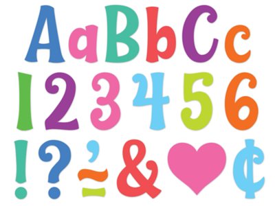 These self-adhesive pieces featuring a playful font in bright, bold colors will enhance your classroom decor and help you stay organized. The pieces are removable and repositionable, making it easy to create bulletin boards, stations, teaching aids and labels without the hassle. Made from durable materials, the self-adhesive pieces ensure long-lasting displays that will withstand daily classroom use. And their easy-to-peel backing makes them a breeze to apply—no more struggling with crooked letters. You get a pack of 222 self-adhesive pieces, including upper- and lowercase letters, numbers and punctuation marks; uppercase letters measure 4".