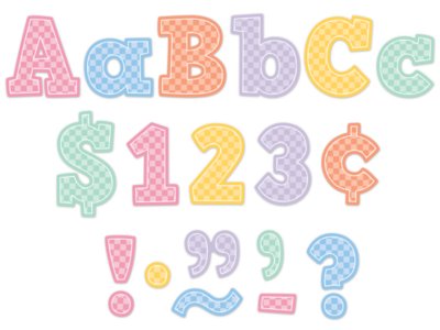 Display easy-to-read messages anywhere with these colorful block cutouts. Use the pieces to create a back-to-school bulletin board, welcome students to the classroom, make a letter board and more. The trendy checkered pattern comes in 6 pastel colors: pink, blue, yellow, green, orange and purple. Set includes 230 pieces, including upper- and lowercase letters, numbers, punctuation marks and Spanish accent marks; uppercase letters measure approximately 4".