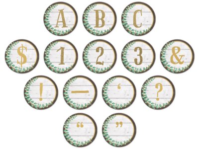 Accessorize your classroom with these natural-looking eucalyptus-themed circle punch-outs! Add them to pennants, word walls and displays to create your own unique messages. You get a pack of 216 punch-outs, including uppercase letters, numerals, ordinal numbers, punctuation marks and symbols; each piece measures 3 1/2" in diameter.