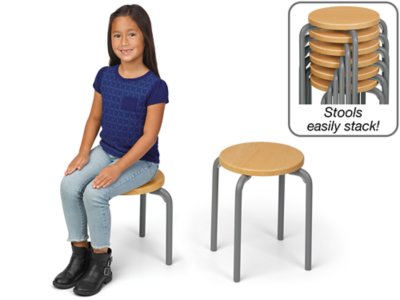 Our ultra-durable stools are perfect for adding seating anywhere in the classroom—and their space-saving, easy-stack design makes it simple to store them out of the way! Featuring 4 sturdy metal legs with plastic bumpers and glides and a tough laminate seat, each stool is sure to withstand years of daily classroom use.