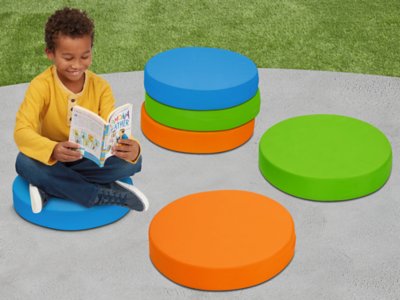 Comfy enough for indoor use yet rugged enough for the outdoors, our durable, all-weather floor cushions provide the perfect spot for kids to sit and relax! Plus, the removable fade- and water-resistant covers are machine-washable—for easy care! You get 6 thick foam cushions in 3 colors.
