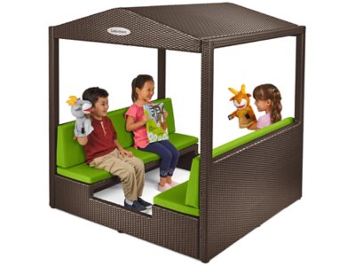 Here’s a cool, covered place where children can sit, relax and play! Our outdoor cabana is made from wicker-like, weather-resistant plastic and features a large shade canopy that completely covers the open seating area. The embedded metal frame ensures durability to withstand the elements. Plus, the 2 comfy built-in benches include thick foam, no-slip cushions that are held in place by hook & loop straps, with machine-washable covers that won’t fade. The unit even has easy-leveling feet so it always sits flat. Assembly required.