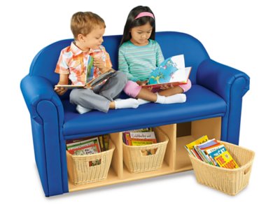 Transform any spot in the room into a cozy reading nook! Our roomy couch features a sturdy wooden frame and comfortable foam padding...with a vinyl cover that’s a cinch to wipe clean. Plus, 3 storage cubbies on bottom keep tons of books in easy reach! Perfect alone or with our Plastic Book Baskets (sold separately).