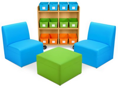 Make the most of your space—with modular seating that’s easy to arrange and rearrange…and a mobile book storage center and handy book bins! Combine the chairs and ottoman for tons of seating possibilities, or use the ottoman as a table or footrest. The chairs and ottoman are padded with high-density foam for extra support and comfort. To keep them looking like new, simply wipe the smooth, durable vinyl clean. The book center and 12 tough plastic bins with labels make it easy to store tons of books in a minimum of space. The rugged laminate center has 3 shelves…plus 3" locking casters, so you can roll it anywhere. The center measures 32"w x 14 1/2"d x 32 1/4"h, is GREENGUARD® Gold Certified and comes with a lifetime warranty.