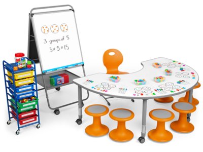 Help children develop math skills—with an all-in-one instruction zone packed with tons of engaging materials! Featuring thoughtfully selected items perfect for boosting proficiency with math—from place value and operations to money skills and fractions—the zone also includes high-quality furniture to make working with small groups of up to 6 students a breeze! You can even work directly on the surface of our write & wipe table during small-group time to check for understanding, guide practice and more. You also get a mobile organizer cart along with multisensory manipulatives, plus custom activity cards designed to elevate lessons and support mastery of foundational math skills. The GREENGUARD® Gold Certified table measures 72"w x 48"d x 23"-34"h, includes a 5-year warranty and is easy to assemble. The tray organizer and teaching easel require simple assembly. The fully assembled chairs include a lifetime warranty.Additional Information