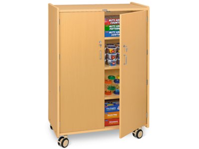 Our functional storage cabinet locks to keep items secure—and easily rolls wherever you need it! The sleek, double-door unit has 4 ultra-sturdy shelves that are deep enough for all sorts of supplies, learning materials, media equipment and more. Plus, it’s made of rugged laminate that quickly wipes clean! Heavy-duty cabinet includes four 4" locking casters.