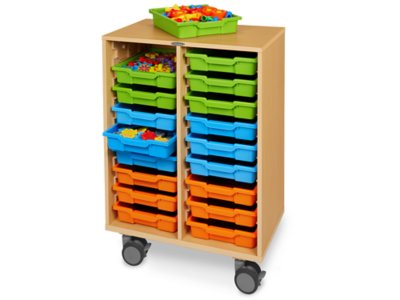 From everyday supplies and materials to notebooks, school-to-home communication and more—our portable center provides convenient access to essential items anywhere in the classroom! The heavy-duty laminate center includes 18 handy removable storage trays that slide in and out easily, with built-in stoppers to prevent the trays from falling. Plus, the center rolls on four 4" locking casters—so it’s a cinch to move exactly where you need it! Durable plastic trays come in the 3 colors shown.