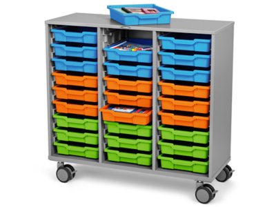 Our convenient portable center keeps everyday supplies and materials, notebooks, school-to-home communication and more right where you need them! The attractive gray unit features 27 removable storage trays that slide in and out easily, with built-in stoppers to prevent the trays from falling. Plus, the durable laminate center includes four 4" locking casters that make it a breeze to move anywhere! Rugged plastic trays come in the 3 colors shown.