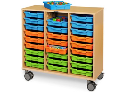 From everyday supplies and materials to notebooks, school-to-home communication and more—our portable center provides convenient access to essential items anywhere in the classroom! The heavy-duty laminate center includes 27 handy removable storage trays that slide in and out easily, with built-in stoppers to prevent the trays from falling. Plus, the center rolls on four 4" locking casters—so it’s a cinch to move exactly where you need it! Durable plastic trays come in the 3 colors shown.