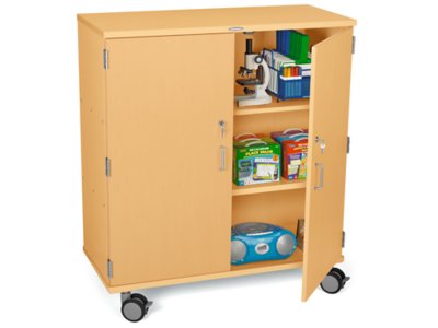 Our functional storage cabinet locks to keep items secure—and easily rolls wherever you need it! The sleek, double-door unit has 3 ultra-sturdy shelves that are deep enough for all sorts of supplies, learning materials, media equipment and more. Plus, it’s made of rugged laminate that quickly wipes clean! Heavy-duty cabinet rolls on 4" locking casters.
