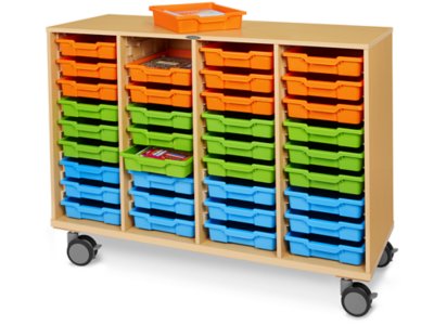 From everyday supplies and materials to notebooks, school-to-home communication and more—our portable center provides convenient access to essential items anywhere in the classroom! The heavy-duty laminate center includes 36 handy removable storage trays that slide in and out easily, with built-in stoppers to prevent the trays from falling. Plus, the center rolls on four 4" locking casters—so it’s a cinch to move exactly where you need it! Durable plastic trays come in the 3 colors shown.