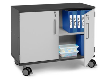 Our sophisticated, ultra-functional storage cabinet locks to keep contents safe and secure—and easily rolls wherever you need it! The double-door unit features 2 shelves that are deep enough for all sorts of supplies, learning materials, media equipment and more. Plus, the rugged laminate exterior quickly wipes clean, and the 4" locking casters offer convenient mobility.