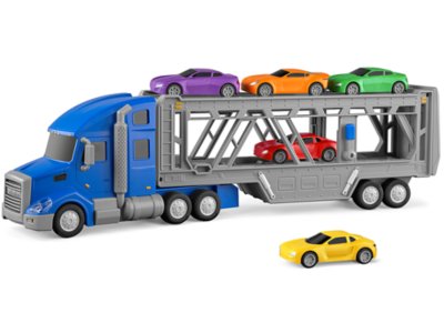 This rig and its cargo of 5 sleek sports cars are ready for long-haul action! Featuring real-rolling wheels, a cabin that rotates 90 degrees for easy turns, plus a double-decker trailer that opens in the rear and includes ramps that raise and lower, the super-size rig is primed for highway adventures. And when it’s time to send the cars zooming, simply lift the ramp to unload the vehicles on the bottom level and push the lever to release the ones on top! Measuring over 2 feet long, the rig is set for big-time, road-trippin’ fun. Just take it—and its fleet of autos—for a spin!