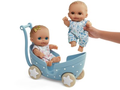 Stroll into playtime with adorable twin babies ready to see the world! Dressed in coordinated onesies and wearing the sweetest smiles, the 2 poseable dolls sit comfortably together in the two-seat carriage—the cutest way to roll from one delightful stop to the next! The removable clothing is even machine-washable for easy care. Stroller measures 10 1/2" in length.