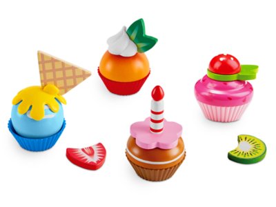 Time for a sweet treat—kids make their own cupcake creations with this super-cute playset! They first put cupcakes into the cups…mix & match the toppings and accessories…“serve” their unique desserts…then take ’em all apart to start again. The combinations are endless! It’s a fun way to promote creativity and develop matching skills. Set includes 18 pieces—4 plastic cups, 4 wooden cakes and 10 silicone and wood accessories; largest piece measures 2 1/2" in length.