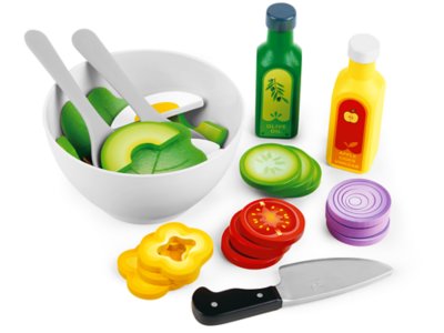 Introduce kids to an array of salad ingredients and inspire healthy eating habits with this realistic playset! Featuring lots of colorful vegetables and toppings to mix & match, “slice” and “toss,” it’s a delightful way to boost fine motor development and build sorting and counting skills as children play. The 39-piece set includes a kid-safe bowl, knife, spoon and fork, plus a mix of wooden and felt ingredients. Bowl measures 3" x 5 1/2".