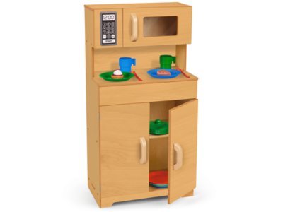 Exceptionally crafted and incredibly durable, our child-sized hardwood microwave and pantry unit provides years of imaginative play. It features kid-friendly safety hinges that protect against injured fingers and chunky handles that make the doors easy to open and close. Plus, it has plenty of space for both display and storage! Play dishes and food sold separately.