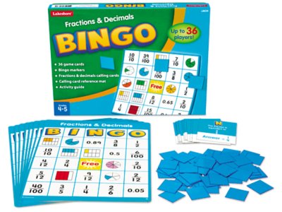 This fast-paced bingo game helps students explore equivalencies and conversions between fractions and decimals—hands on! The game is similar to traditional bingo, so it’s super-easy for children to learn…they simply listen to clues, then try to find the matching numbers or images on their game cards. You get 36 different game cards, 60 calling cards, 528 marker chips and a calling card reference mat that makes it a cinch to see what cards you’ve called out.